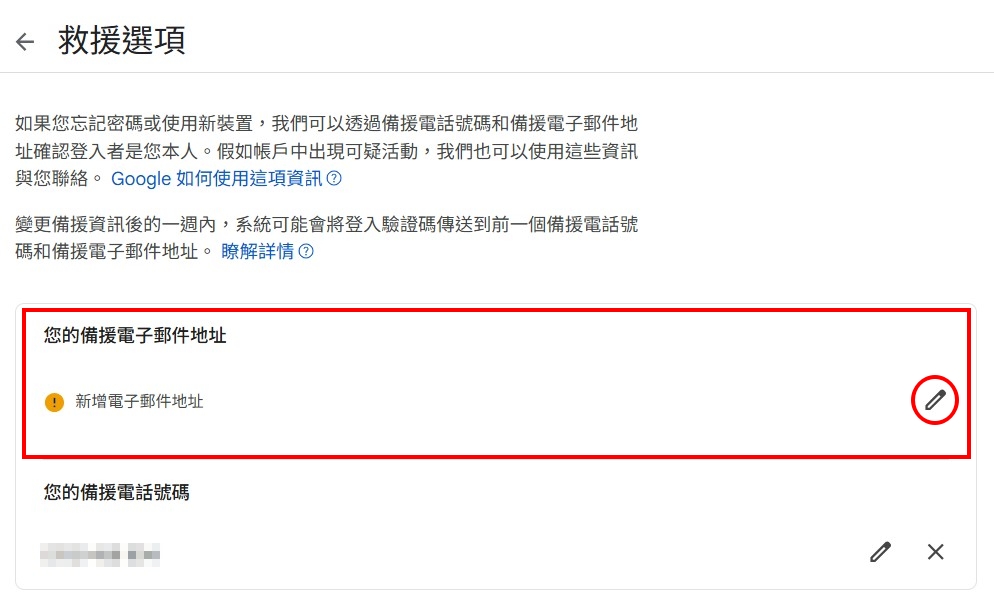 1.填寫備援電子郵件地址,以利日後密碼重設。