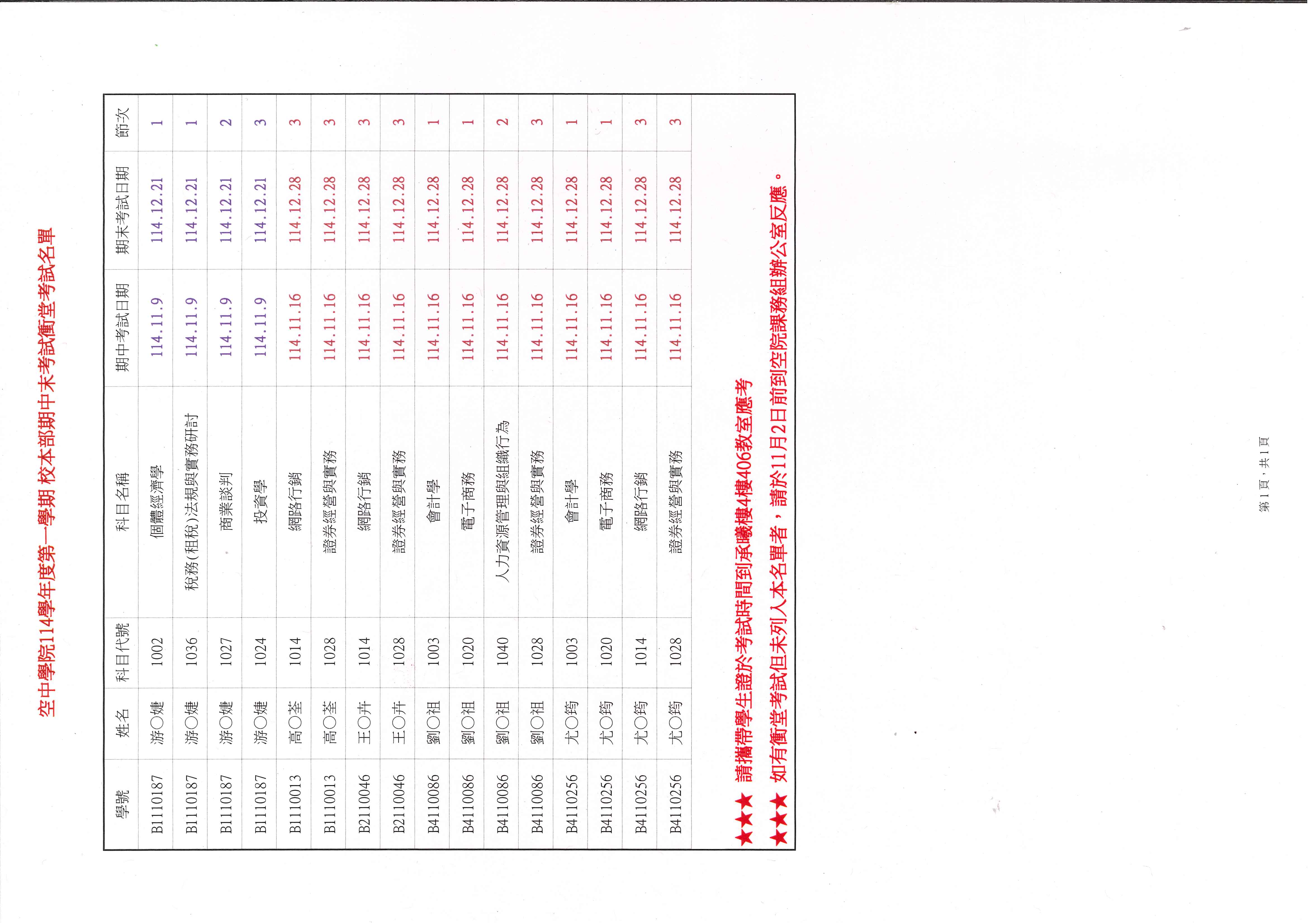114學年度第一學期校本部期中末考試衝堂考試名單