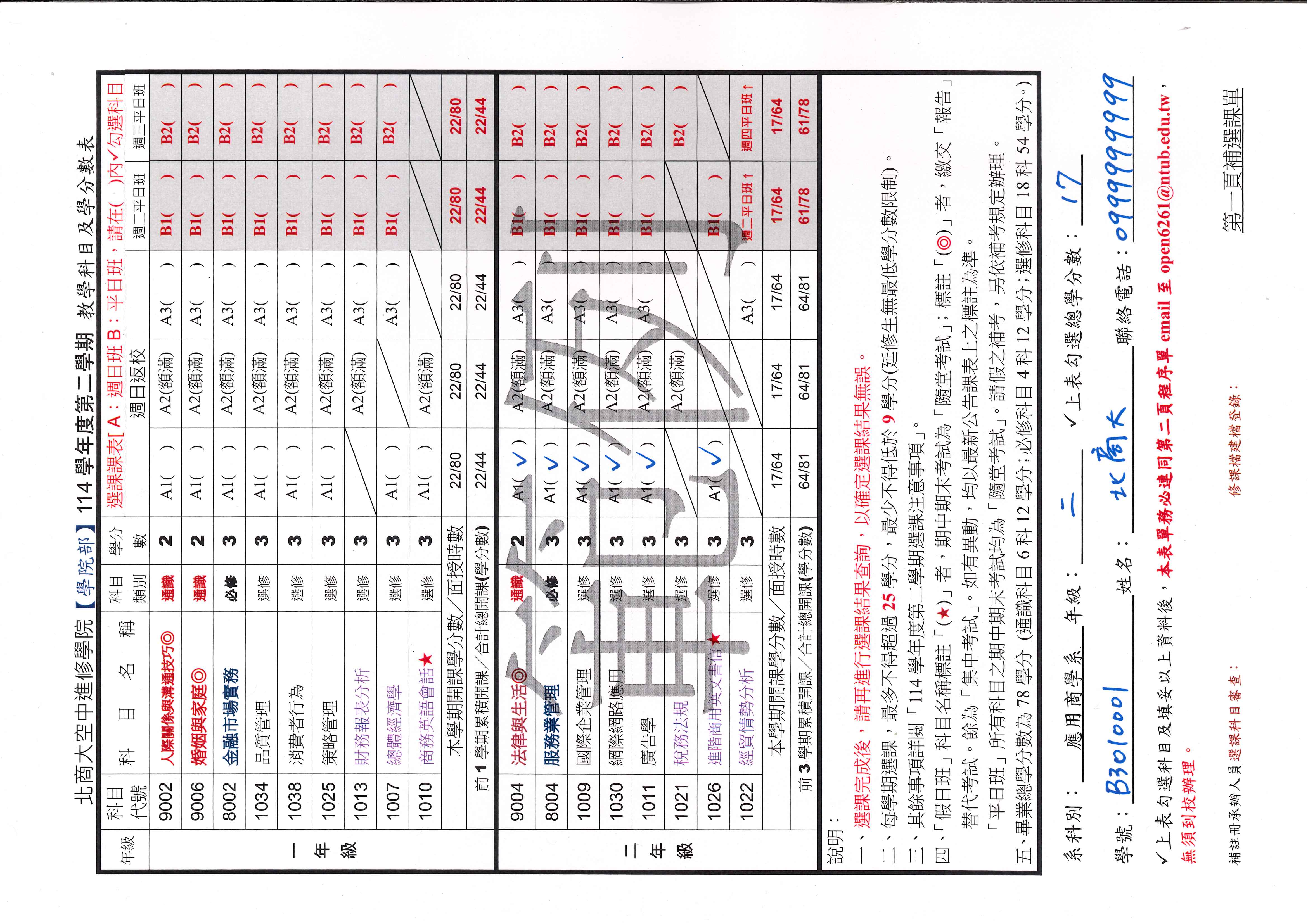 注意!辦理補選課註冊、加選請填好附件檔案(補選課單及程序單)並且在2/24(二)上午9:00起至 2/25(三)中午12:00止 email 到指定信箱,屆時會收到系統自動回覆信件。若遇各課表額滿,會以電話聯絡重新補選課註冊、加選,因各課表有選課人數限制,故會依來信順序辦理補選課註冊、加選。
